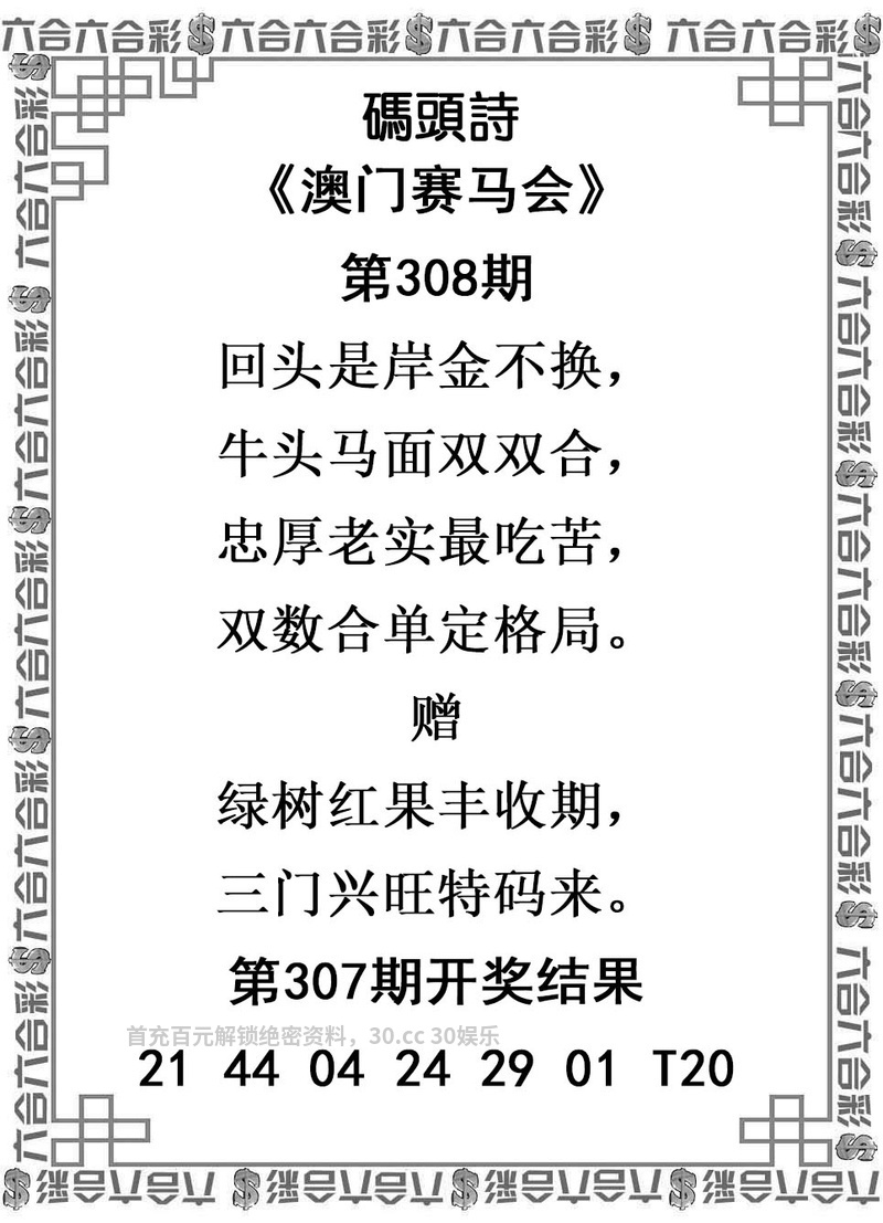 308期解析:回头是岸金不换,牛头马面双双合,忠厚老实最吃苦,双数合单定格局。 综合生肖:鸡兔马蛇鼠猴 必中四肖:鸡兔马蛇 暴富一肖:鸡  |